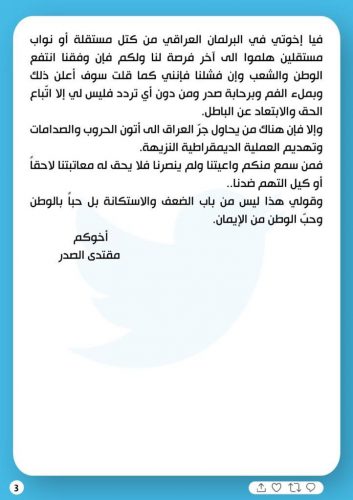الصدر يدعو للخروج من “عنق التوافق” ويؤكد: خرجت لأصلح وطني
