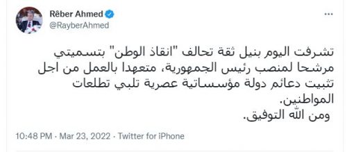 ريبر أحمد: تشرفت بتسميتي مرشحا لمنصب رئيس الجمهورية
