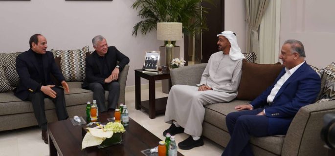 وتابع البيان، انه عقد أثناء الزيارة في العقبة لقاء بين عاهل الأردن جلالة الملك عبد الله الثاني، ورئيس جمهورية مصر العربية عبد الفتاح السيسي، ورئيس مجلس الوزراء مصطفى الكاظمي، وولي عهد أبو ظبي نائب القائد الأعلى للقوات المسلحة في دولة الإمارات العربية المتحدة الشيخ محمد بن زايد آل نهيان، وحضر اللقاء وزير الدولة عضو مجلس الوزراء في المملكة العربية السعودية الأمير تركي بن محمد بن فهد بن عبد العزيز.