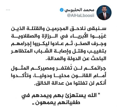 رئيس البرلمان بتغريدة نارية: سنبقى نلاحق المجرمين الذين غيبوا الابرياء بالرزازة والصقلاوية وجرف الصخر وقتلوا المتظاهرين