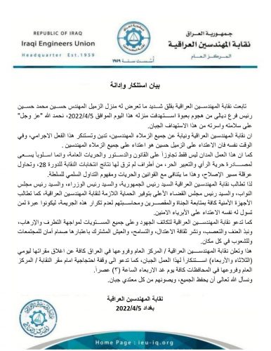 بالوثيقة.. نقابة المهندسين تستنكر محاولة الاغتيال لرئيس النقابة فرع ديالى