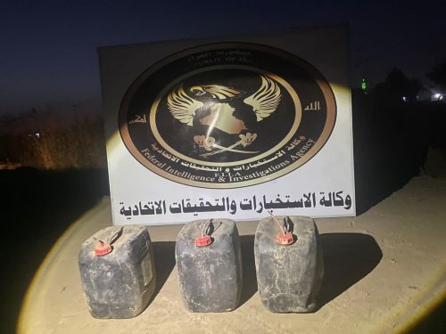 واشار، “اما العملية الثالثة و المنفذة في قضاء عگرگوف، ضبط فيها كدس للعتاد من مخلفات داعش الارهابي احتوى على ثلاثة عبوات محلية الصنع على شكل جلكان (٢٠) لتر مخبأة تحت الارض”.