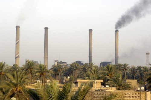 تظاهر العشرات من أصحاب معامل الأسفلت والعاملين، الأحد، قرب مصفى الدورة النفطي جنوبي العاصمة بغداد.