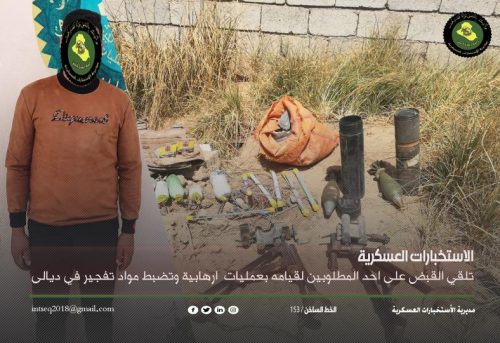 أعلنت مديرية الاستخبارات العسكرية، القاء القبض على مطلوب بتهم ارهابية ومداهمة نفقاً وضبط مواد تفجير في ديالى والانبار.