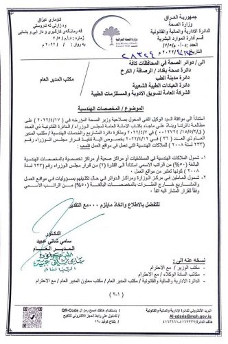 وزارة الصحة تصدر قرارا بشأن رواتب الملاكات الهندسية في المستشفيات