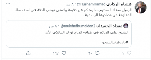 وقال الركابي في تغريدة إن “المعلومات بشأن وجود علي حاتم سليمان بضيافة المالكي غير صحيحة”.
