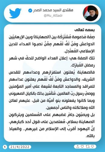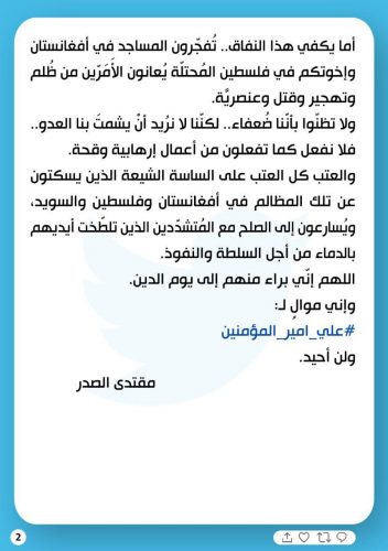 مقتدى الصدر يغرد بشأن استهداف المساجد في افغانستان: يستهدفون المسلمين ويتركون الصهاينة بسلام