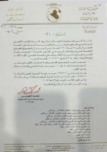 بالوثيقة:خريج كلية القانون يتم تعينه من الحلبوسي مستشارا إقتصاديا في البرلمان بدرجة خاصة