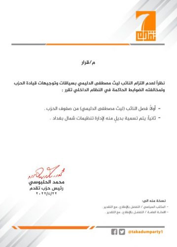 بالوثيقة.. حزب تقدم يفصل النائب ليث الدليمي ويقرر تسمية بديلا عنه لتنظيمات شمال بغداد