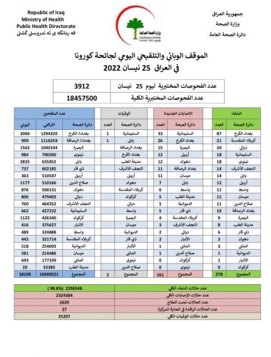 الصحة تسجل 161 اصابة جديدة بفايروس كورونا