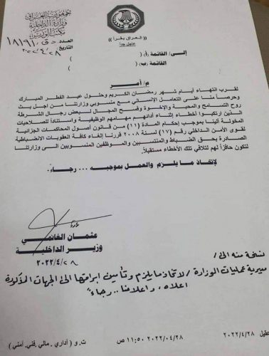 بالوثيقة.. وزير الداخلية يلغي جميع العقوبات عن الضباط والمنتسبين