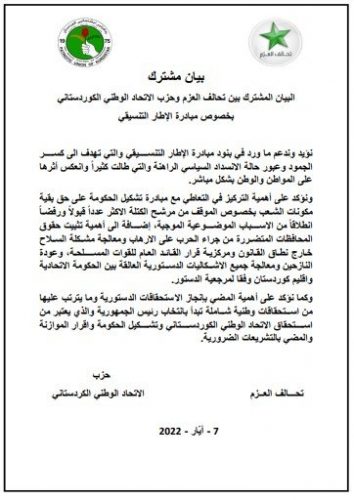 العزم والاتحاد الوطني يعلنان تأييدهما لمبادرة الإطار التنسيقي في بيان مشترك