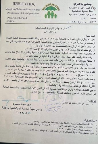 بالوثيقة: هيئة الرعاية تطالب باضافة تريليون دينار لقانون الدعم الطارئ لشمول 300 الف عائلة