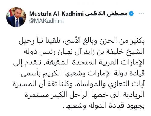 رئيس الوزراء الكاظمي يعزي بوفاة رئيس الإمارات