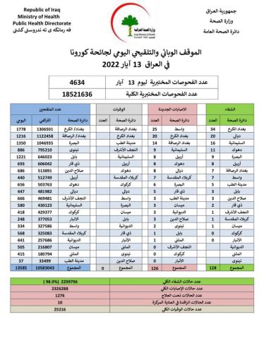 الصحة تسجل 126 اصابة جديدة بكورونا