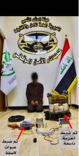 واضاف، تم ضبط احزمة ناسفة بحوزة الإرهابي وعبوات لاصقة و صواعق تفجير كان ينوي تفجيرها على القوات الامنية والمواطنين.