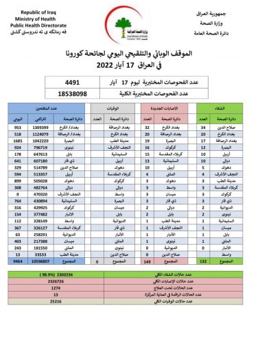 الصحة تسجل 149 اصابة جديدة بكورونا