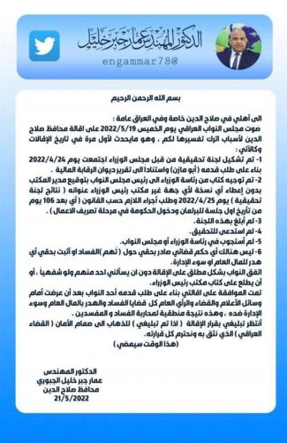 بتغريدة .. محافظ صلاح الدين عن قرار اقالته: لم ابلغ باستجوابي ولا حكم قضائي صدر ضدي