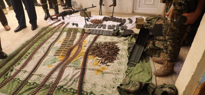 واشارت الى”ضبط بداخل المنزل سلاح نوع (PKC) عدد (1) وبندقية نوع كلاشينكوف عدد (2) ومخازن عدد (27) مع (2573) إطلاقة”.