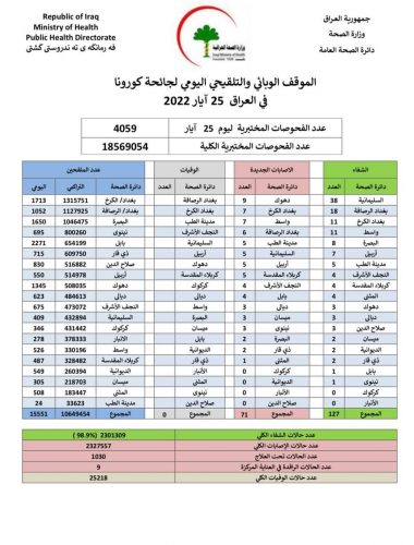 الصحة تسجل 71 اصابة جديدة بكورونا