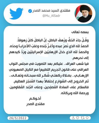 وخاطب السيد الصدر شعب العراق بالقول “عليكم بعد التصويت في مجلس النواب العراقي على قانون (تجريم التطبيع مع الكيان الصهيوني الإرهـابـي.. بصـلاة ركعتي شكر لله سبحانه وتعـالـى.. ثم الخروج إلى الشوارع إحتفالاً بهذا المنجز العظيم”.