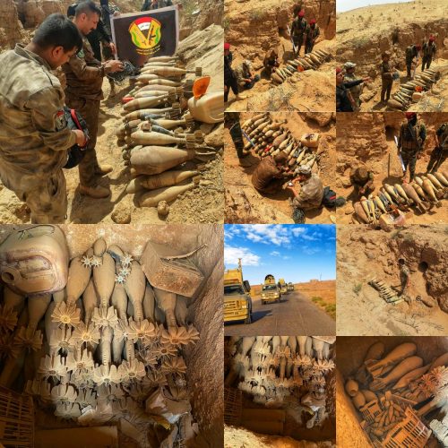 وتابع البيان، انه على ضوء تلك المعلومات تحركت قوة من اللواء الثامن عشر ومفرزة من استخبارات اللواء ومفرزة من كتيبة هندسة الميدان، تم خلالها العثور على (65) قنبرة هاون عيار (120) ملم و(5) قنابر عيار (60) ملم وصاروخ كاتيوشا عدد (2) وصاروخ محلي الصنع عدد (2) من مخلفات عصابات داعش الإرهابي، حيث تم رفعها واتلافها من قبل مفارز الجهد الهندسي. انتهى