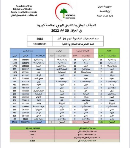 الصحة تسجل 111 اصابة جديدة بفيروس كورونا