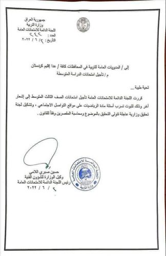 بالوثيقة : التربية تقرر تأجيل امتحانات الثالث المتوسط إلى إشعار آخر