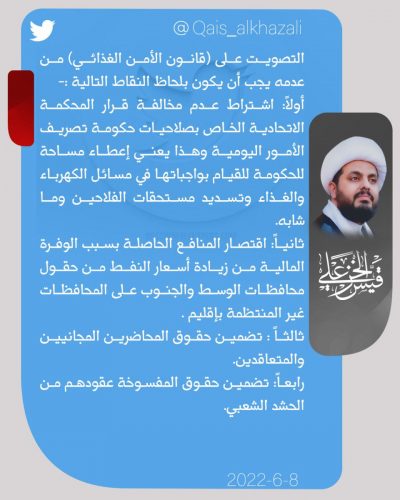 الخزعلي يغرد بشأن قانون الأمن الغذائي