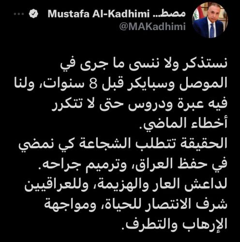 الكاظمي مستذكراً سبايكر: الحقيقة تتطلب الشجاعة وعلينا حفظ العراق وترميم جراحه