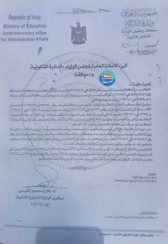 بالوثيقة. التربية تخاطب أمانة مجلس الوزراء بشأن إصدار الأوامر الإدارية للمحاضرين والإداريين