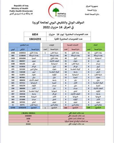 الصحة تسجل 344 اصابة جديدة بفايروس كورونا