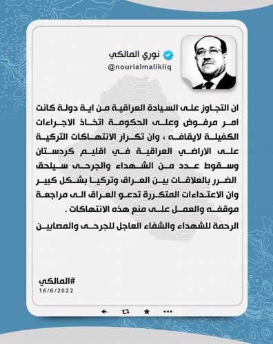 بتغريدة .. المالكي: تكرار الانتهاكات التركية على الأراضي العراقية سيلحق الضرر على علاقات البلدين
