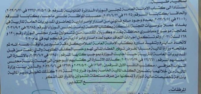 بالوثيقة : التربية تخاطب محافظة بغداد لمعالجة ملف محاضري 2020