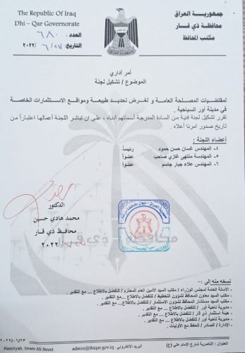 بالوثيقة : محافظ ذي قار يوعز ببدء الاستثمار السياحي في المدينة الاثرية