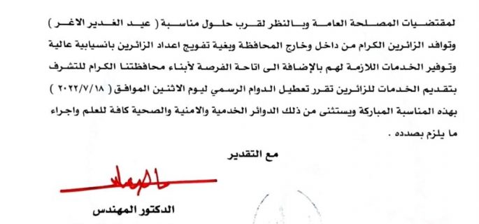 بالوثيقة : محافظة النجف تعطل الدوام الرسمي بهذا اليوم