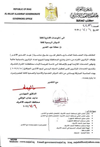 بالوثيقة : محافظة النجف تعطل الدوام الرسمي بهذا اليوم
