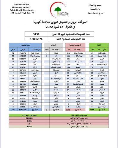 الصحة تسجل 2270 حالة اصابة جديدة بكورونا