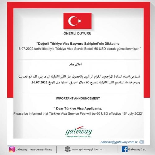 وذكرت السفارة في وثيقة انه “تم تحديث رسوم خدمة التقديم للفيزا التركية لتُصبح 60 دولاراً أمريكياً اعتبارا من تاريخ 16 من شهر تموز الجاري بعد ما كانت 50 دولاراً”.انتهى