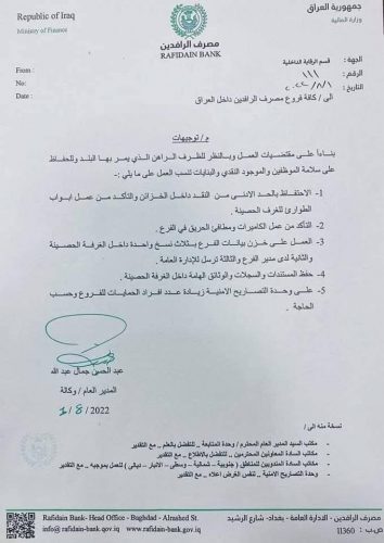 بالوثيقة :الرافدين يصدر 5 توجيهات للحفاظ على النقد داخل فروعه