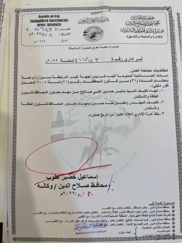 بالوثيقة.. تكليف عثمان طه بمهام معاون محافظ صلاح الدين لشون الطاقة والاستثمار