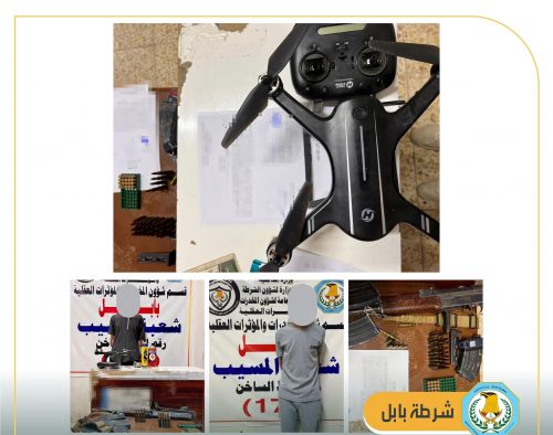 وذكر بيان للقيادة تلقت *الرأي* الدولية نسخة منه، أن العملية نفذتها مفارز شعبة مخدرات قضاء المسيب بالإشتراك مع مفارز الأمن الوطني بإسناد قوة SWAT “بناءً على معلومات مؤكدة”، مشيرة الى أن القوة ضبطت بحوزة المتهمين على كمية قليلة من المخدرات وأدوات التعاطي فضلاً عن طائرة مسيرة “درون” مع سلاح بندقية وعدد من الاطلاقات النارية مختلفة الأنواع وحزام نسيجي مع أسطوانة بلاستيكية فارغة وبطارية 12 فولت وأسلاك بطول 30سم مربوطة بشريط لاصق على شكل “حزام ناسف خالي من المواد المتفجرة”.