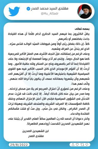 مقتدى الصدر يعلن “الاعتزال النهائي”: الكل في حلٍ منّي