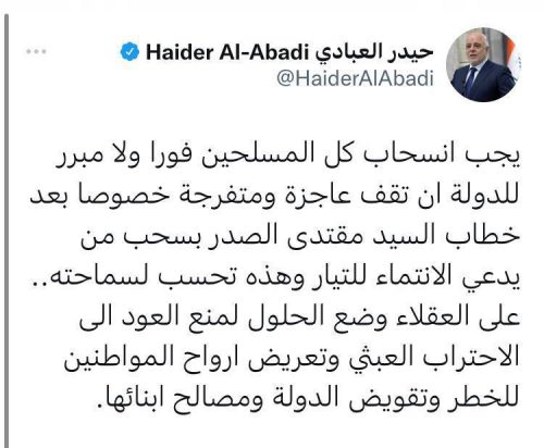 بتغريدة العبادي: على العقلاء وضع الحلول لمنع العودة إلى الاحتراب العبثي