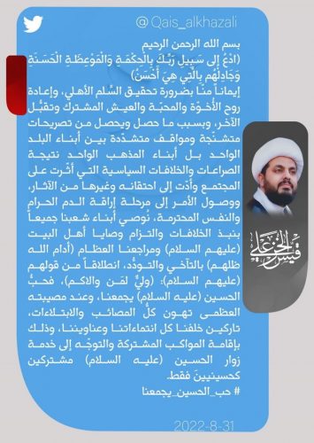 الخزعلي يوصي بنبذ الخلافات والتزام وصايا أهل البيت(ع) والمرجعية