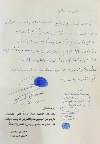بالوثيقة : الصدر يتعهد بحماية علي الشريفي