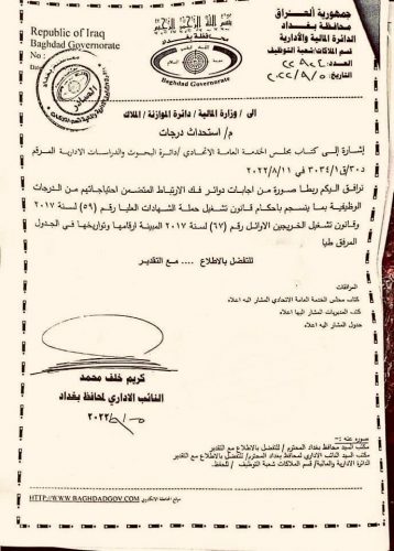 بالوثيقة.. محافظة بغداد ترفع حاجتها من الدرجات الوظيفية للشهادات العليا والاوائل