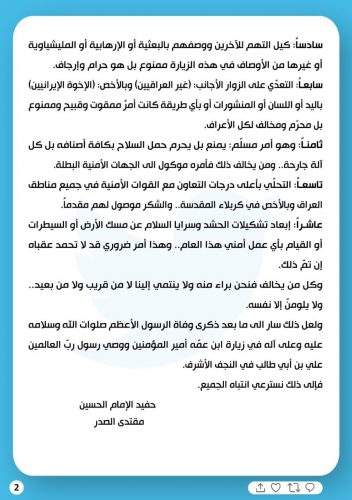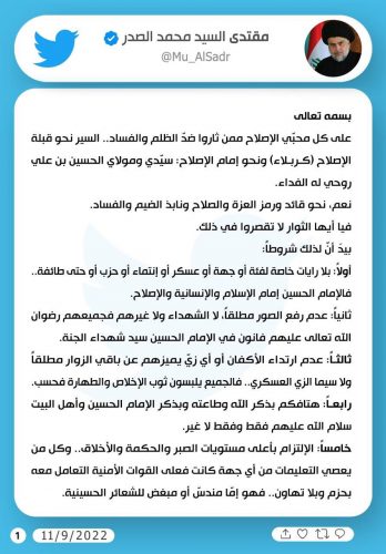 الصدر: على كل محبى الإصلاح .. السير نحو قبلة الإصلاح (كربلاء) ونحو إمام الإصلاح
