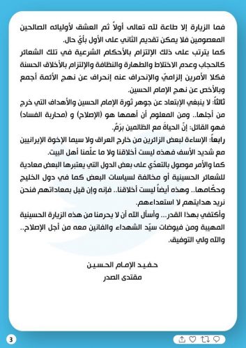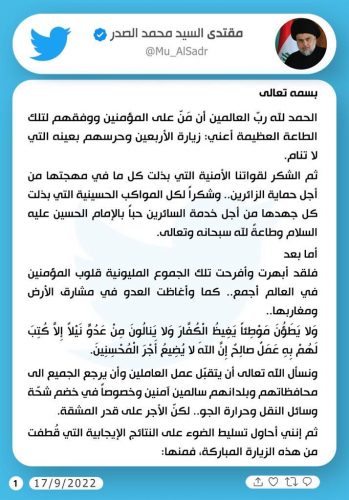 مقتدى الصدر يسلط الضوء على نقاط إيجابية في الزيارة الاربعينية