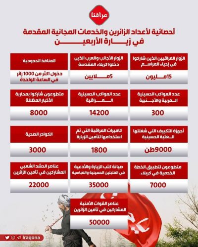 وفي وقت سابق، أكدت العتبة العباسية، أن “عدد المواكب المشاركة في زيارة الأربعين بلغ 14500 موكباً منها 300 موكب من دول عربية وأجنبية”.
